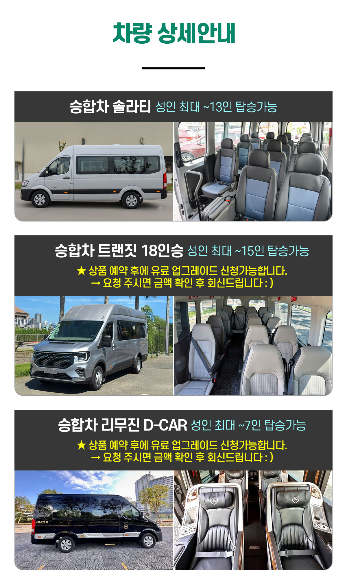 (2) 호이안지역 : 승용차,SUV, 승합차,승합차-솔라티 15만동 / 승합차-18인승, 승합차-리무진(디카) 30만동
