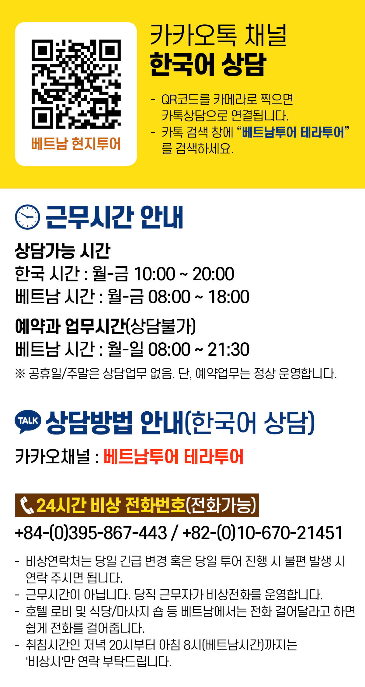 ★ 근무시간 안내 - 상담가능 시간 : 월-금 10:00 ~ 20:00 (한국시간) / 월-금 08:00 ~ 18:00 (베트남시간) - 예약과 운영시간(상담불가) : 월-일 08:00 ~ 21:30 (베트남시간) ※ 공휴일/주말은 상담업무 없음. 단, 예약업무는 정상 운영합니다. ★ 상담방법 안내 (한국어상담) → 카카오채널 검색 : 베트남투어 테라투어 ★ 24시간 비상전화번호(전화가능) +84-(0)395-867-443 / +82-(0)10-670-21451 → 비상연락처는 당일긴급 변경 혹은 당일 투어진행시 불편 발생시 연락주시면됩니다. → 근무시간이 아닙니다. 당직근무자가 비상전화를 운영합니다. → 호텔로비 및 식당/마사지 샵등등 베트남에서는 전화걸어달라고 하면 쉽게 전화를 걸어줍니다. → 취침시간인 저녁 20시부터 아침 8시(베트남시간)까지는 '비상시'에 '만' 연락부탁드립니다.