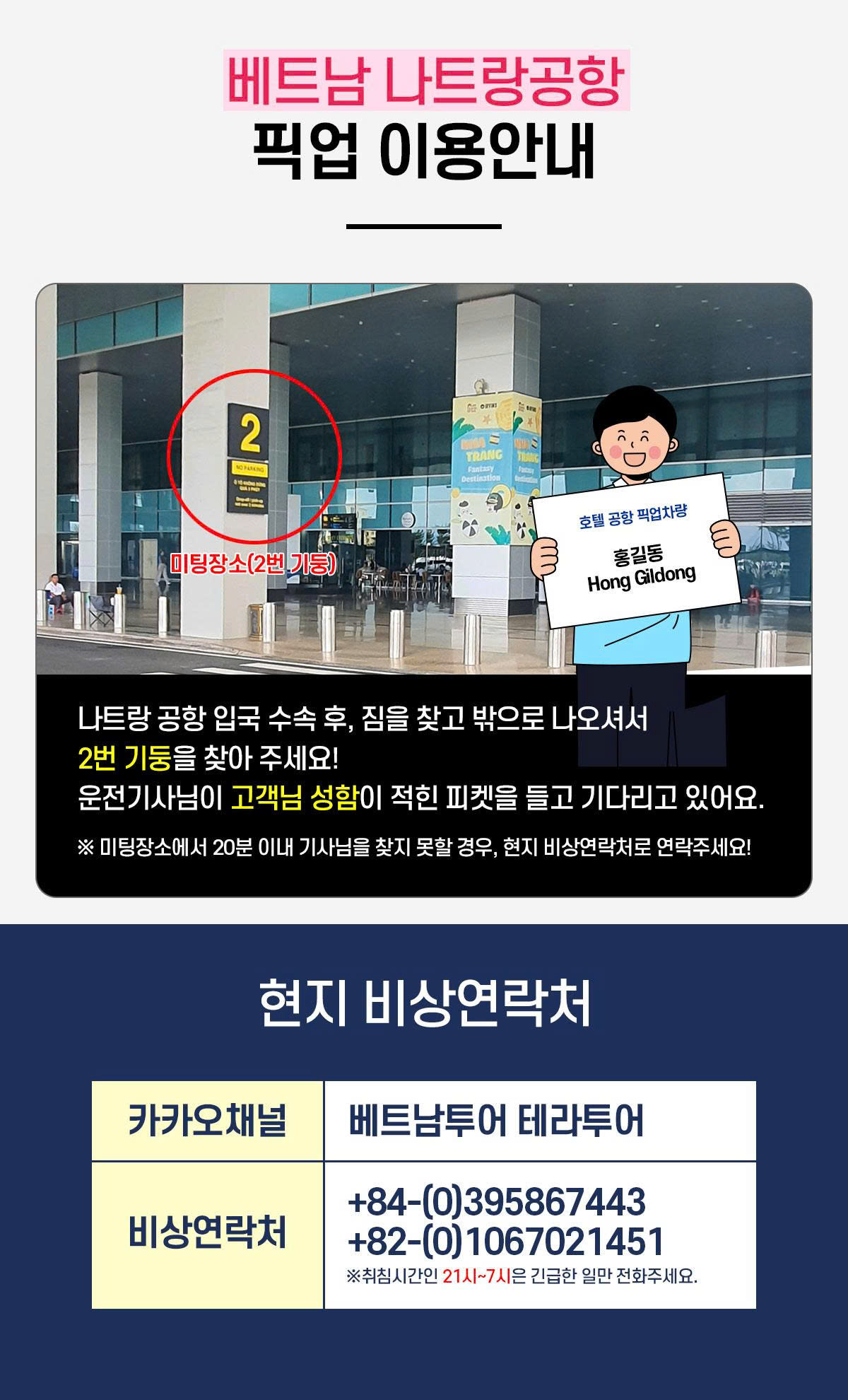 🛬 나트랑공항 미팅 → 공항픽업시, 픽업장소에 공항&비행기편명을 기재해주세요. → 공항 픽업은 실제 비행기 도착 시간 기준, 입국 수속 시간을 고려하여 기사님이 미팅장소에서 피켓을 들고 대기합니다. → 렌트 이용 시간은 공항에서 기사님과 만난(미팅한) '미팅 시점'부터 시작되며, 예약하신 시간만큼 이용 가능합니다. → 한 예약으로 여러 항공편을 함께 픽업받는 것은 원칙적으로 어렵습니다. 부득이하게 함께 이용을 원하실 경우, 아래 내용을 꼭 확인해주세요. - 픽업 예약 1건당 등록 가능한 비행기편명은 1개입니다. - 기사님은 등록된 편명의 실제 도착시간을 기준으로 최대 1시간 30분까지 대기하며, 다른 항공편 도착을 기다릴 경우 추가요금이 발생할 수 있습니다. - 여러 항공편을 이용하시는 경우, 등록된 편명 기준으로 픽업이 진행되오니 일행분들은 공항에서 먼저 모이신 후 기사님과 만나주세요. ※ 기사님은 여러 예약을 진행하므로, 일정에 지장이 없도록 협조 부탁드립니다. [국제선] 미팅장소는 짐찾고 출구 나오셔서 2번기둥입니다. 2번기둥에서 고객님 성함적힌 피켓들고있는 기사님 만나시면되며, 미팅후 기사님과 함께 주차장으로 이동후 차량탑승하셔야 합니다. [국내선] 미팅장소는 건물밖으로 나오셔서 횡단보도건너시면 바로앞에 피켓들고있는 기사님 만나시면됩니다.
