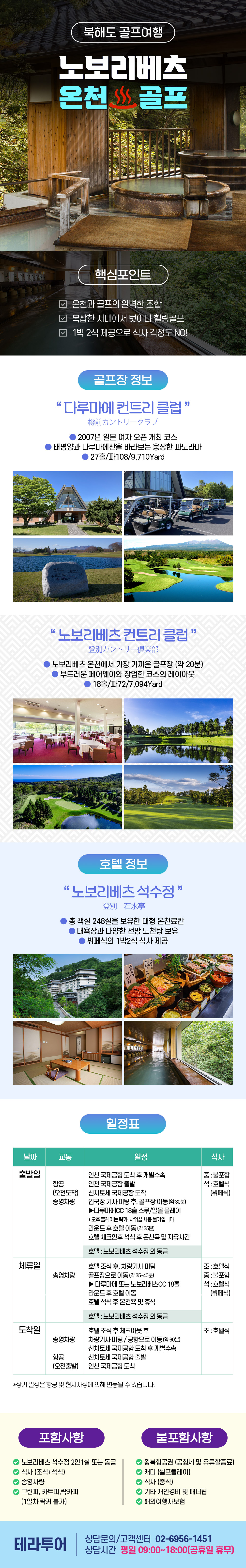 • ★해당상품은 항공불포함이며, 항공포함 견적은 개별문의 바랍니다. ★일본 현지 휴전일 및 휴일(골든위크: 4/27~5/6 7/20, 오봉기간:8/7~8/16, 9/19~23, 10/12) 별도 문의 부탁드립니다. ※ 상기 요금은 4인 이상 출발 요금입니다. ※ 2인 or 3인 플레이시 골프 할증 비용 (1인/18홀 기준) : 다루마에CC 주중 2B 1만원, 주말 2만원 (3B챠지없음) 노보리베츠CC 주중,주말 : 2B 2만5천원, 3B 1만원 토,일,휴일: 오전플레이 : 2B 5만원, 3B 1만원 / 오후플레이 : 2B 3만원, 3B 1만원 ※ 2인 or 3인 출발시 송영 추가 비용 : 2박3일 : 3인출발시 80,000원/1인/전일정 UP, 2인출발시 120,000원/1인/전일정 UP 일본 연휴날짜 숙박 적용시 13만원 추가 : 7/18,19,09/20,21,22,23 10/11 일본 휴일 라운드 진행시 7만원 추가 : 5/6,7/20,9/21,22,23,10/12 <필독> ※ 송영차량 공항-골프장-호텔간 이용만 가능 / 단독 차량 탑승 불가, 동승자가 있을 수 있습니다. 타루마에CC 송영차량-중형버스 2대보유, 차량 부족 시 택시로 송영되어 추가요금이 발생됩니다 (4인-7만원, 3인-9만원, 2인-15만원 UP (1일기준 1인 송영추가요금) ※ 온천호텔은 싱글룸이 없으며,2인사용금액을 1인이 지불해야됩니다 (단, 가능여부 별도문의) ※ 차량 시간 변경은 꼭 여행사를 통해 문의 부탁드립니다. 현장에서 임의로 변경 시 재변경이 어렵습니다. ※ 구간별로 차량 및 기사가 달라질 수 있으며, 차량에 개인짐을 둘 수 없습니다. ※ 일본인 차량기사는 송영만 도와드리며, 골프장 체크인 및 호텔 체크인은 여권제시를 통해 개별적으로 하셔야 합니다. ※ 출발전 확정서에 차량 출발시간 기재해서 안내드립니다. 출발 전날 혹은 당일 현지에서 송영시간 변경 어렵습니다. ※ 라운딩이 일찍 끝나도 차량은 정해진 시간에 도착합니다. (시간 변경 불가/일찍 끝나셨을 경우에는 대기 부탁드립니다.) ※ 당일 골프가 너무 밀리는 경우 차량 출발시간을 기준으로 2시간 전에 연락 주셔야 변경 요청 가능 ※ 최종확정시에 골프장이 배정되며 골프장 변경 및 지정은 불가능합니다. (견적서상의 골프장과 상이할 수 있으며, 현지상황에 따라 같은 골프장이 두번 배정될 수 있습니다.) ※ 클럽 중식 및 음료는 불포함 기준이며, 이용 후 골프장에서 개별정산 하시면 됩니다. ※ 출발전 확정서에 호텔 출발시간, 티오프시간 공지드립니다. 참고 부탁드립니다. ※ 고객님 문제로 송영 늦어지는 경우 라운딩 불가할 수 있음 / 출발 5분전 미리 1층 호텔정문 앞 대기 必